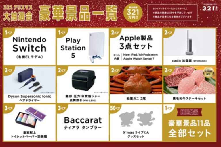 該当期間に、321ライバーを⼀定数以上応援してくれたリスナーさんが、ライバーとペアで応募できる抽選会。Apple製品やダイソンのドライヤー、加湿器、⾼級蟹等が当たるイベントで、1等はまさかの全品セット!